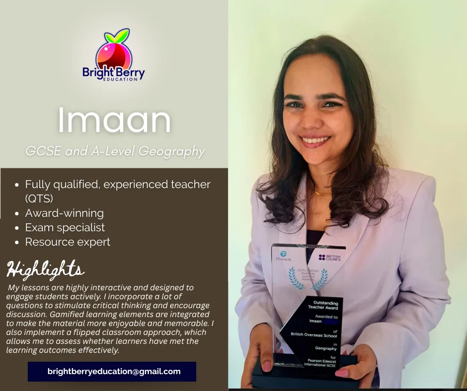 As an award-winning geography teacher, Imaan brings expert knowledge and a passion for the subject to every lesson. She tailors her teaching to suit your child’s learning style, helping them understand complex topics and build confidence.