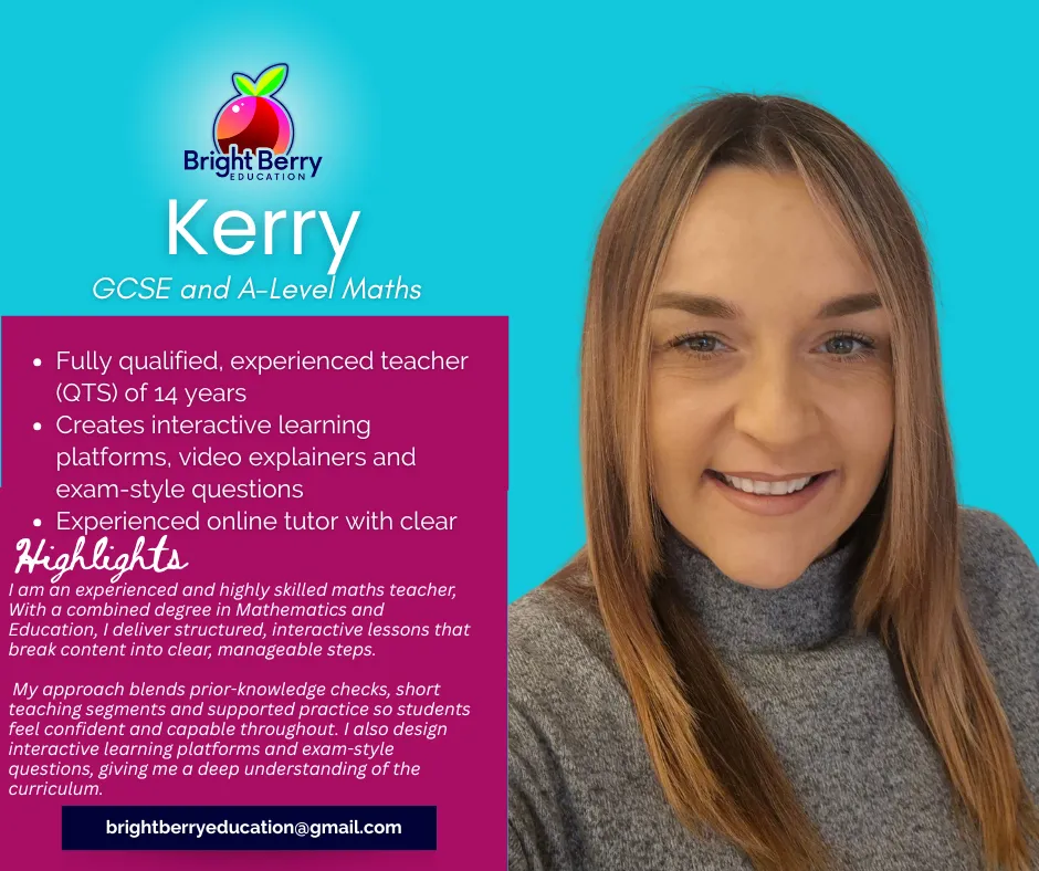 Kerry is a warm, knowledgeable and highly experienced maths teacher. With a combined degree in Mathematics and Education, she specialises in GCSE Maths and understands exactly how to build confidence, close gaps and develop strong problem-solving skills.
