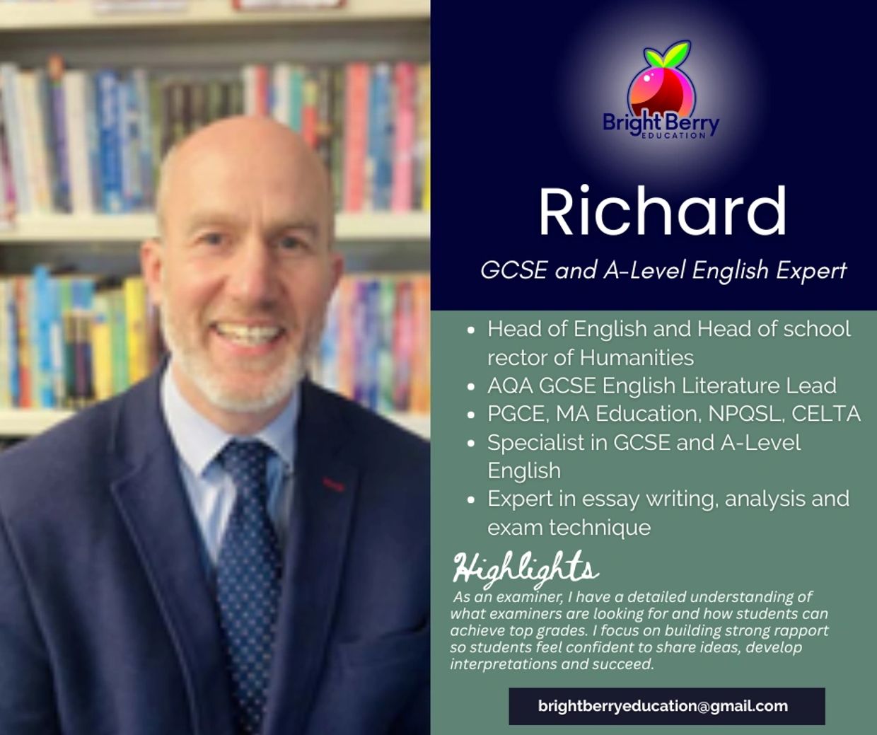 At Bright Berry Education, we work exclusively with qualified teachers because quality matters. Richard’s leadership experience, examiner insight and academic expertise ensure students receive premium English tuition that delivers real progress.
