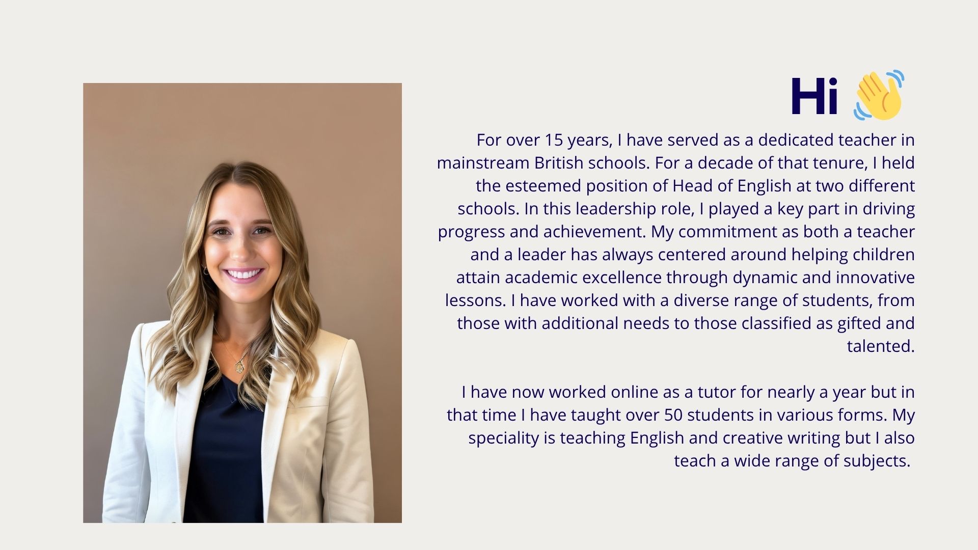 I take great care in selecting only the most qualified and experienced tutors. Each tutor undergoes a thorough vetting process, including checks on their qualifications, teaching experience, and DBS (Disclosure and Barring Service) status to ensure your child's safety and the highest level of professionalism. But I don’t stop there—our tutors are regularly monitored and their lessons are reviewed to maintain the quality and consistency that we promise to every student.